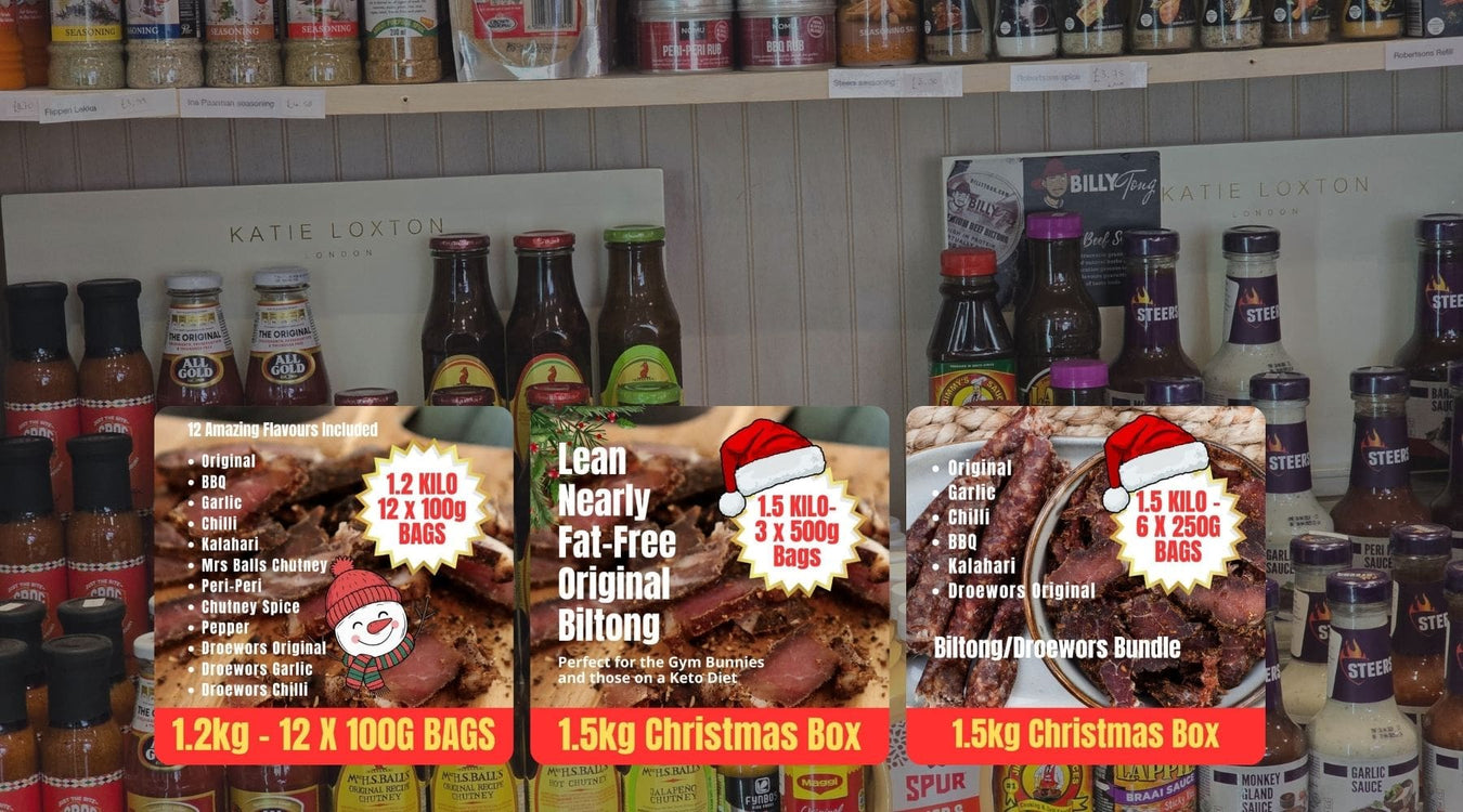Welcome to Billy Tong, your South African store in Cobham, Surrey. We specialise in bringing the authentic flavours of home straight to your door — from freshly made biltong and droëwors to braai meats, Durban curries, bunny chow, and frozen favourites. Stock up on Peppermint Crisp, Nik Naks, Mrs Ball’s chutney, or enjoy a cold Castle Lager or Savanna cider just like you would back home.